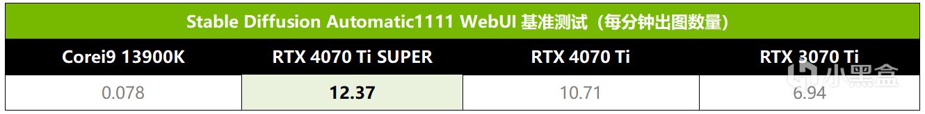 从测试结果可以看到,RTX 4070 Ti SUPER每分钟出图数量达到12.37张,明显超越RTX 4070 Ti的10.71张,比RTX 3070 Ti更是快了约78%。当然,要是和Core i9 13900K相比的话,RTX 4070 SUPER出图效率是它的159倍。