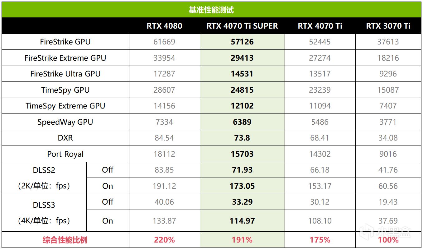 基准性能部分,在DX11的FireStrike系列测试中,RTX 4070 Ti SUPER领先RTX 4070 Ti大约8%~9%,在DX12的TimeSpy系列测试中,RTX 4070 Ti SUPER领先RTX 4070 Ti大约7%~9%。在SpeedWay、DXR与Port Royal测试中,RTX 4070 Ti SUPER最高可领先RTX 4070 Ti大约16%,特别是负载更重的DX12U项目SpeedWay,领先幅度尤其明显。此外,在DLSS项目测试中,RTX 4070 Ti SUPER在开启DLSS后的优势都非常明显,最高达到了13%。综合来看,RTX 4070 Ti SUPER相对RTX 4070 Ti的基准性能平均提升幅度接近10%,达到了RTX 4080的87%,是RTX 3070 Ti的1.91倍。