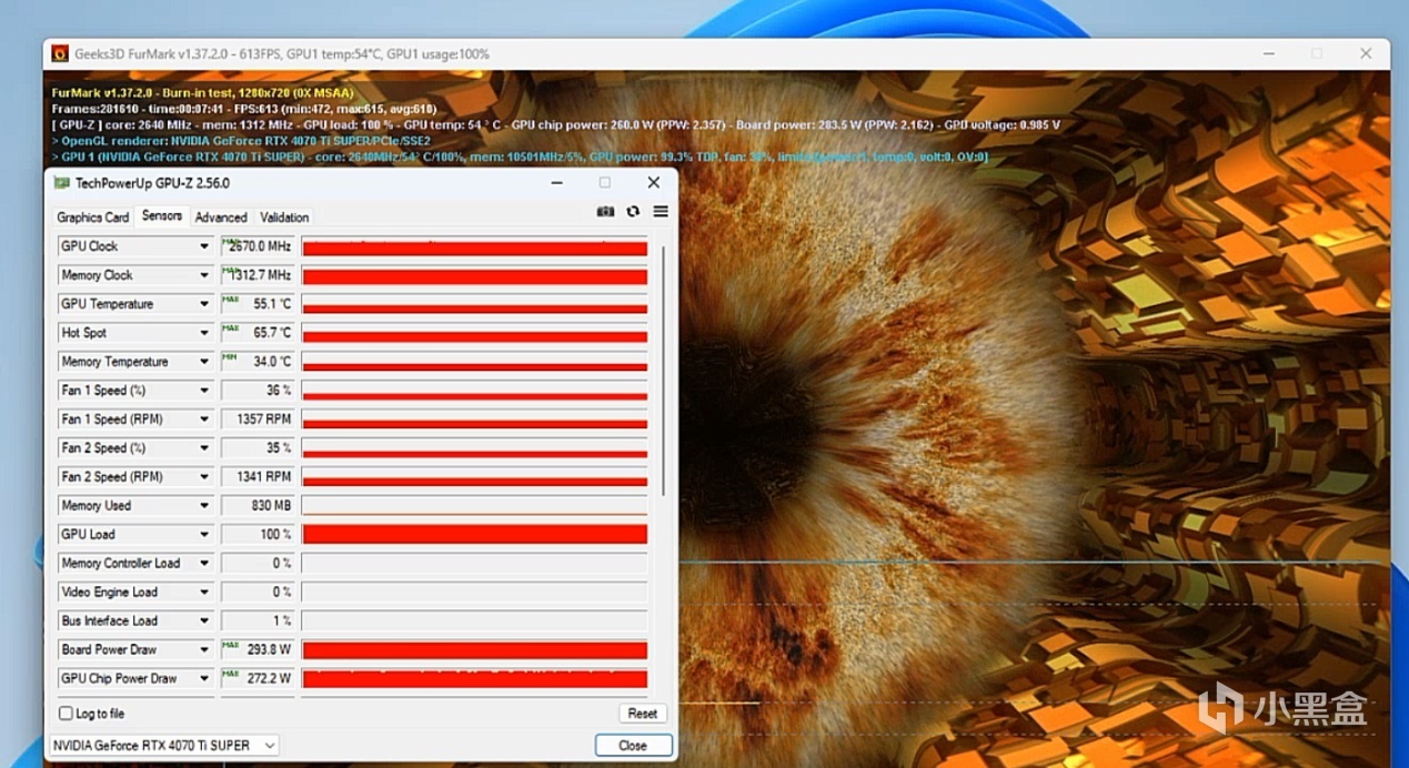 功率和温度方面,我们使用Furmark对RTX 4070 Ti SUPER超级雕进行考机,在跑满整板功率的情况下,GPU温度最高55.1℃,热点最高65.7℃,显存最高36℃,可见其3风扇风之力散热系统相当强大,确保了显卡在近300W输出的情况下也能保持足够凉爽,而且此时风扇转速也仅有36%,静音效果也相当出色。实际上,在玩游戏的时候RTX 4070 Ti SUPER超级雕的游戏功率大多数时候是跑不到极限的,多数时候都保持在230W左右,所以显卡会更加凉快、静音,这也是RTX 40 GPU高能效比的优势所在。