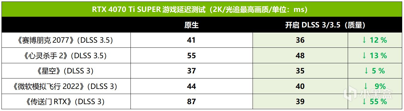 DLSS 3(包含Reflex)除了可以大幅提升游戏帧率,还可以降低帧延迟和操作延迟,提升玩家操控的响应速度。从FrameView监测的PCL延迟来看,RTX 4070 Ti SUPER开启DLSS 3后,绝大部分游戏的延迟都大幅下降,最高下降幅度可达55%,流畅度明显增加,效果十分给力。