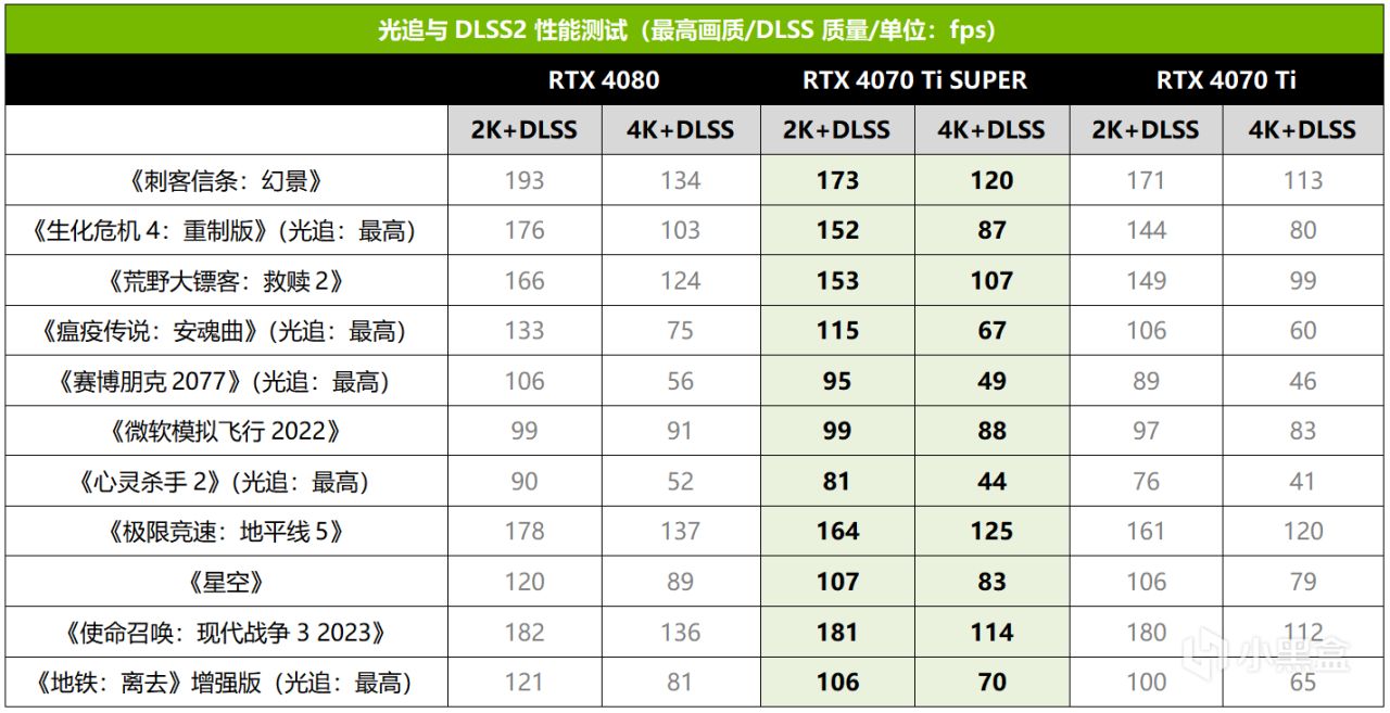 综合整个游戏测试的情况来看,RTX 4070 Ti SUPER相对RTX 4070 Ti总体有大约10%的性能提升,也差不多能达到RTX 4080大约87%~90%的性能,定位确实是相当精准的。同时,RTX 4070 Ti SUPER在2K极限画质设置下可以让主流光追游戏大作保持极高的游戏帧率,开启DLSS之后更是可以达到极致流畅的程度,确实称得上是2K光追游戏高帧率旗舰。当然,就算是把分辨率提升到4K,RTX 4070 Ti SUPER也可以让绝大多数游戏保持在平均60fps以上,并且还有DLSS 3/3.5(包含光线重建)黑科技加持来进一步提升帧率与画面质量,体验也是非常不错的。