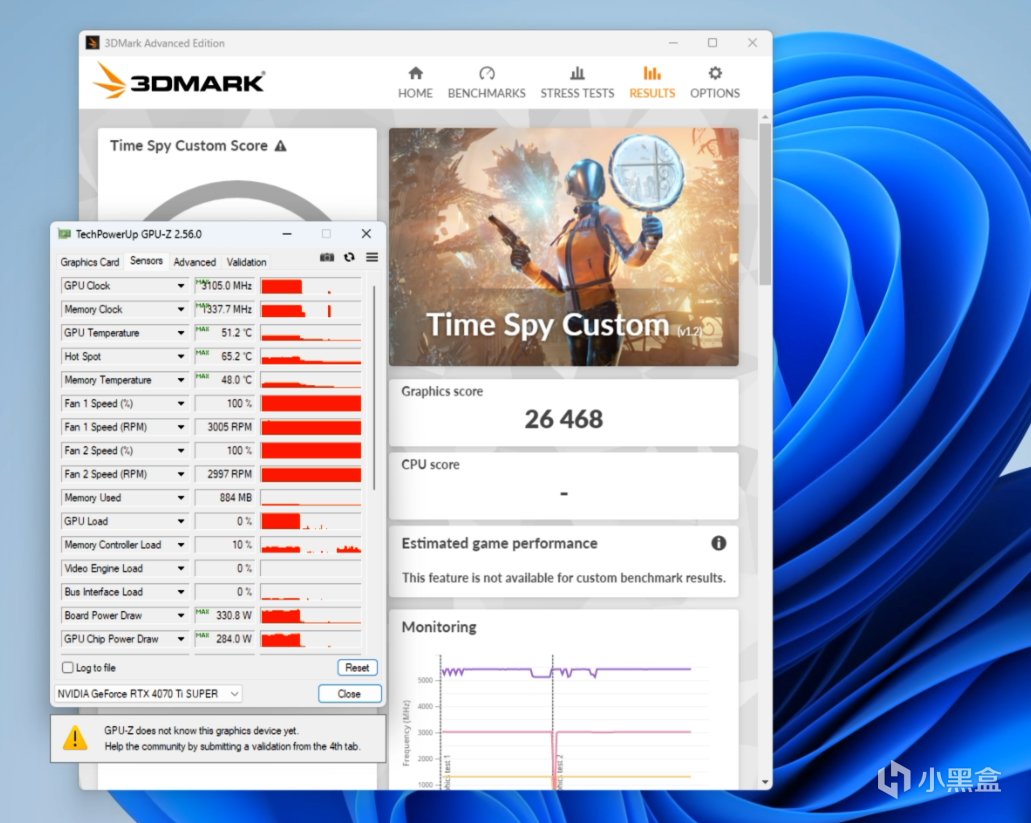 经过简单的尝试,我们进一步将RTX 4070 Ti SUPER超级雕的GPU与显存都提升了200MHz,测试中GPU最高频率达到了3105MHz,TimeSpy得分进一步提升到了26468,最高功率也来到了330W,可见RTX 4070 Ti SUPER超级雕的性能输出是相当可观的。