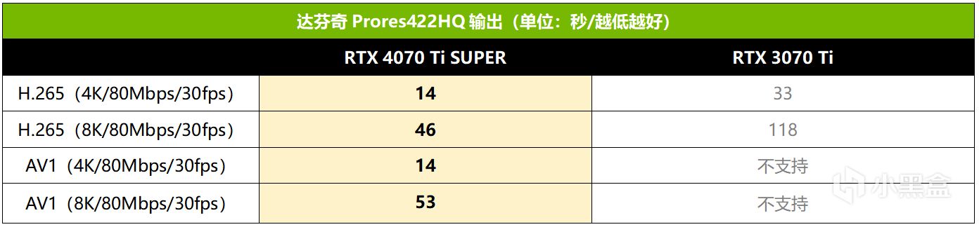 视频转码部分,RTX 4070 Ti SUPER相对RTX 3070 Ti来讲不但升级了效率还增加了编解码器数量,并且加入了对AV1硬件编码的支持,因此从达芬奇编码测试来看,RTX 4070 Ti SUPER相对RTX 3070 Ti的H.265编码速度提升了136%~157%,而AV1硬件编码更是RTX 3070 Ti无法做到的功能。因此,对于需要经常进行视频剪辑的用户来讲,是时候把手中的RTX 3070 Ti升级到RTX 4070 Ti SUPER了。