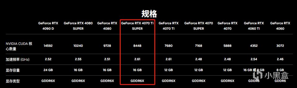 首先RTX4070 Ti SUPER是基于AD103核心打造,而RTX4070\RTX4070 SUPER\RTX 4070 Ti都是基于AD104核心打造。所以,RTX4070 Ti SUPER在性能上是无限接近于RTX4080,如内部搭载的CUDA核心达到了8448个 ,对比之前的RTX4070 Ti提升了至少10%以上;同时,显存位宽也比RTX 4070 Ti的192bit提升到了256bit,显存规格更是达到了16GB GDDR6X。但是,在老黄精湛的刀法下,这颗AD103核心还是有阉割,比如光追核心数(RT Cores)与AI核心数(Tensor Cores)都有所降低等等。