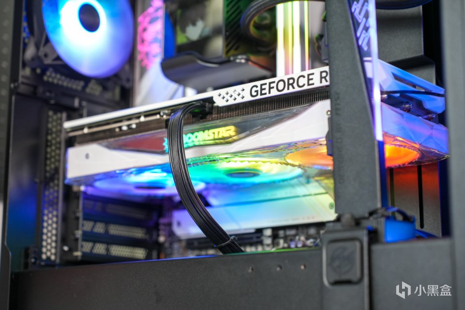 同时得益于MSI Center+ARGB灯光同步的设置,使得整块显卡点亮后的呈现出来的彩虹ARGB灯效非常炫酷。
