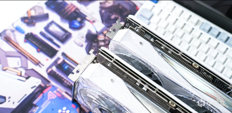 背面双方都搭载了白色的金属的背板,同样也是在尾部采用了大面积的镂空处理,提升散热效率的同时也降低显卡的重量。
