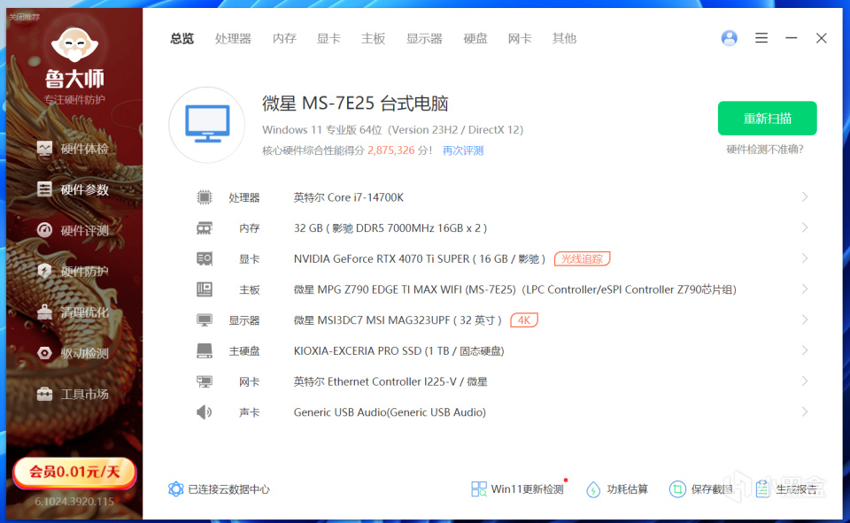 这套平台是最新的intel酷睿14代,之前也测试过RTX4070 SUPER,其中i7-14700K可以说是14代中最不“挤牙膏”的,毕竟比上一代i3-13700K多了4个小核;主板方面也是用新一代Z790主板——微星MPG Z790 Edge Ti Max WiFi,该主板主要是在硬件与功能上进行了更新,比如支持了新增支持Wi-Fi 7和PCIe5.0,并且内存超频表现上更好。