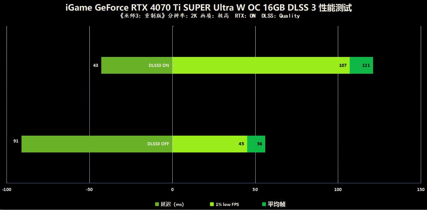 《巫师3:重制版》在更新后完全支持了光线追踪技术以及DLSS 3,在2K分辨率极高光线追踪的情况下,我们的游戏帧数从不足60帧,一跃翻倍提升至121帧的高性能水平!并且游戏的1%LOW帧也大幅提升,延迟也几乎砍半,游戏的流畅度极大的提高了。