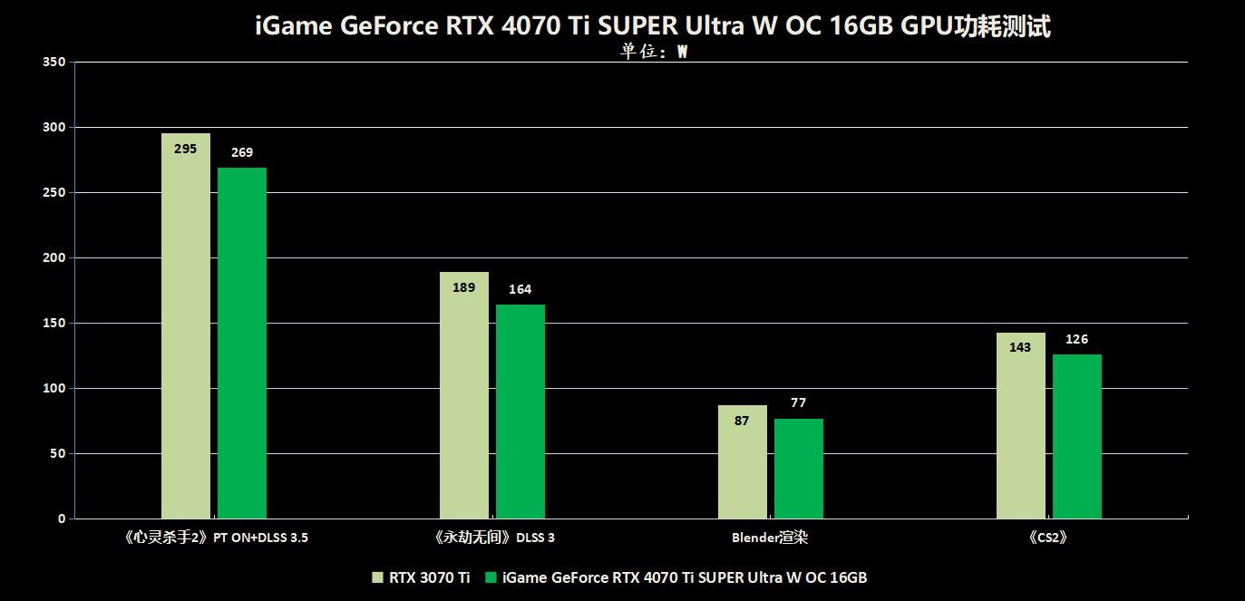 iGame GeForce RTX 4070 Ti SUPER Ultra W OC 16GB运行《心灵杀手2》开启DLSS 3.5后,功耗仅为269W,比起RTX 3070 Ti遥遥领先,在运行网游时更是只有120W左右,在渲染时的功耗也低于RTX 3070 Ti。