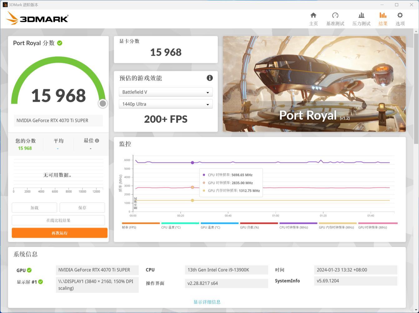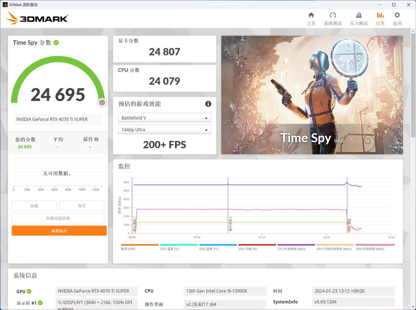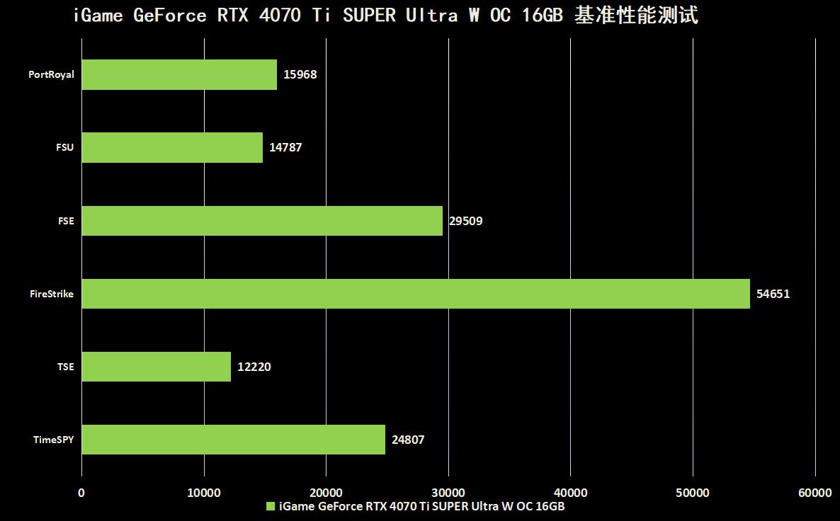 我们使用3D Mark进行iGame GeForce RTX 4070 Ti SUPER Ultra W OC 16GB的显卡理论性能测试,首先是代表着DX 12的TimeSpy测试,得到了24807分的好成绩,在TSE中也获得了12220分.