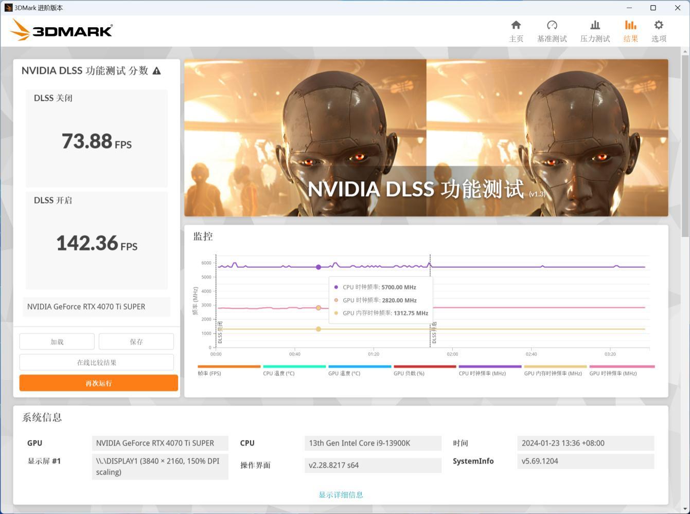 首先我们来看看3D Mark自带的DLSS 3测试,在测试中我们把分辨率调整为2K,DLSS模式调整为“质量”模式,可以看到在未开启DLSS 3之前,画面的帧数仅为78FPS,但是开启了DLSS 3之后,画面的帧数暴涨至142整整提升了一倍!