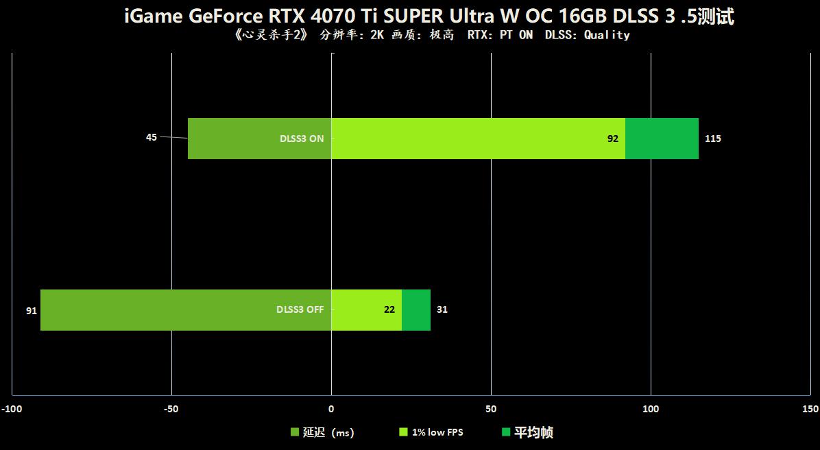 对比开关DLSS 3.5前后,我们发现不仅帧数获得了高达3倍以上的提升来到了115FPS,延迟正好也缩减了一半,游戏手感大幅度提升,从30FPS几乎不可玩的程度来到高帧数,这就是DLSS 3.5带给玩家的震撼体验。