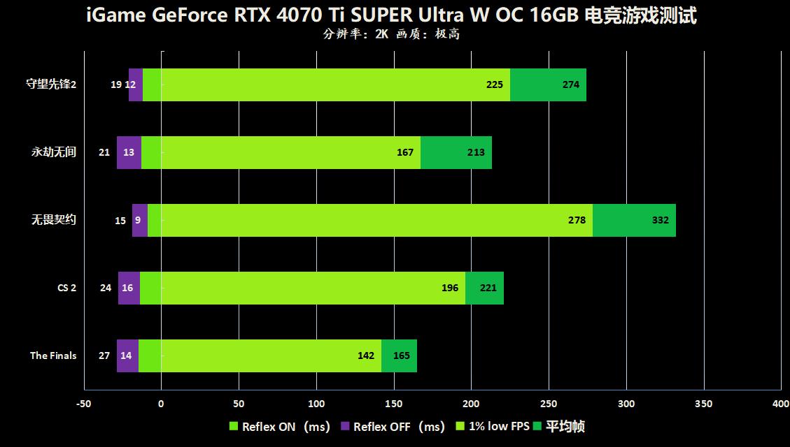 我们首先测试了几款热门的电竞网游,现在电竞网游的玩家也是越来越多了,在激烈的电子竞技中,游戏不仅需要超高的帧数,也需要很低的延迟才能保障玩家在战场中保持高度的竞技状态,这时候iGame GeForce RTX 4070 Ti SUPER Ultra W OC 16GB支持的Reflex技术就派上了大用处,Reflex技术可以有效的消除玩家在操作中的延迟,减轻受 GPU 限制的情况下造成的 CPU 反压,所以在许多热门电竞游戏中都配备了Reflex技术,对于电竞玩家还是非常友好的!