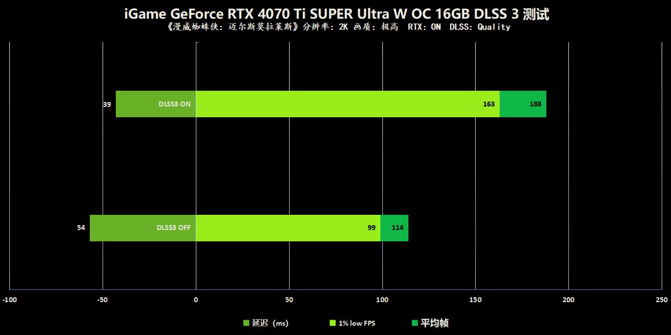 《蜘蛛侠:迈尔斯莫拉莱斯》是一款非常依赖CPU的游戏,而DLSS 3技术正好可以绕过CPU瓶颈,利用光流加速器来进行帧生成,所以在开启了DLSS 3之后游戏帧数上涨了近70帧以上,来到了188FPS这样的惊人高帧率,延迟也下降了20ms左右,在城市中穿梭更加丝滑了。
