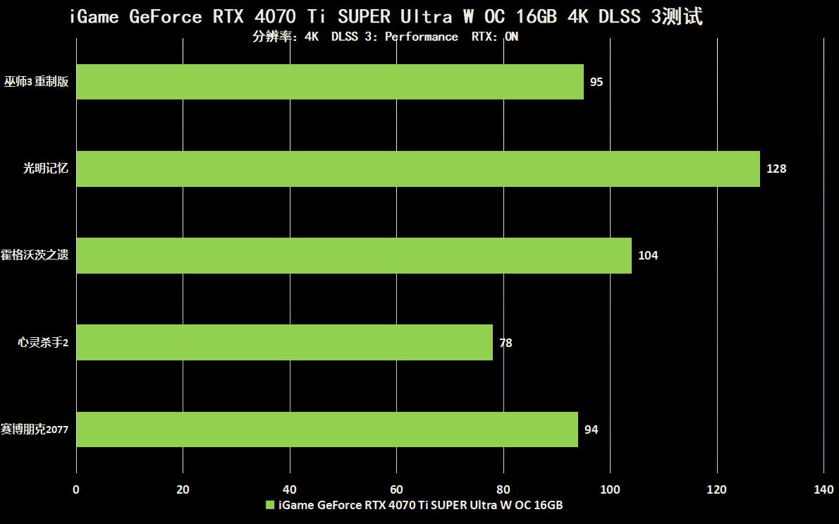 最后来看看iGame GeForce RTX 4070 Ti SUPER Ultra W OC 16GB在4K游戏下的性能表现,这款显卡配备了16GB的海量显存,所以即使在4K分辨率开启光线追踪的情况下表现依然非常可观,搭配DLSS 3技术开启性能模式,即使在开启了光线追踪的情况下,数款3A级别大作依然达到了非常理想的帧数,比如《赛博朋克2077》在开启了路径追踪的情况下依然可以来到90FPS以上的优秀成绩,《心灵杀手2》开启了路径追踪后也可以达到78FPS,而《霍格沃茨之遗》甚至可以来到100FPS以上的惊人帧数,所以iGame GeForce RTX 4070 Ti SUPER Ultra W OC 16GB用来游玩4K分辨率下的3A光线追踪大作是完全没有问题的,随着DLSS 3的技术普及,以后的3A大作都将会获得流畅的帧数。