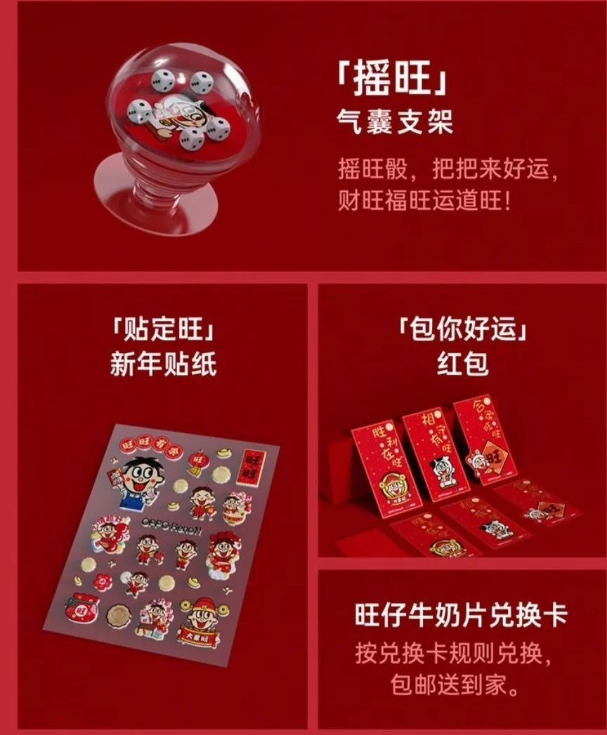 OPPO Reno11旺仔新年联名礼盒内包含团团旺旺移动电源10000mAh、好运成串手机链、力刻旺亚克力木鱼手机支架、摇旺气囊支架、包你好运红包、贴定旺新年贴纸、旺仔牛奶片兑换卡。
