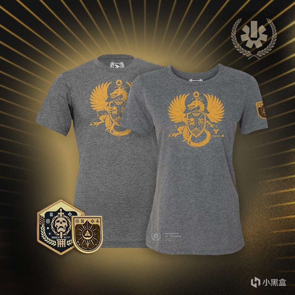 獎勵包含:凱旋時刻2023 T恤購買權(BUNGIE官網周邊商城,成就給的那個遊戲中的代碼沒有任何作用,只起一個說明的作用)、桂冠機靈,鎏金戰車、凱旋時刻2023稱號和實體徽章購買權解鎖