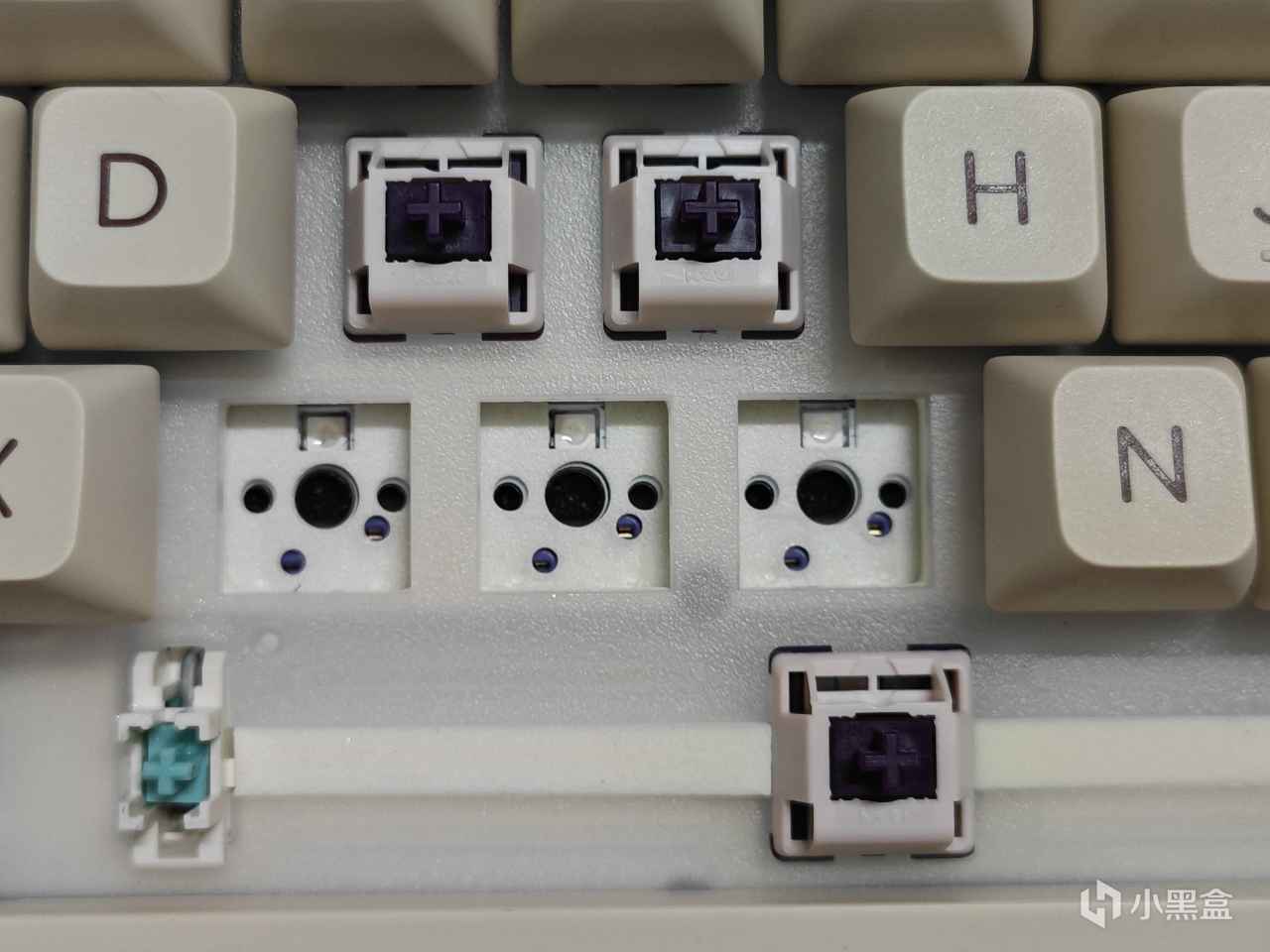 Z98青春版采用的是高端键盘才使用的Gasket结构,拔掉键帽,PC定位板映入眼帘,定位板下依次是poron夹心棉,ixpe轴下垫,pet声优垫,消音底棉,硅胶底垫。五重消音的设计,能有效减少按键的杂音,保留最纯粹的按键声音,使得声音更加HIFI。