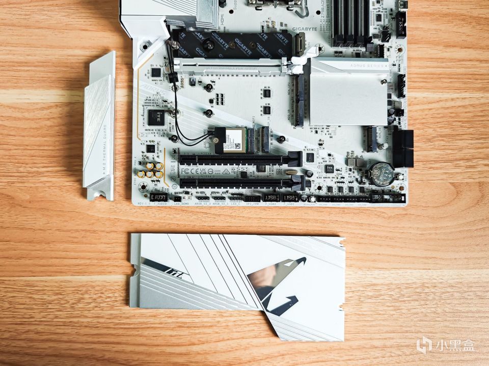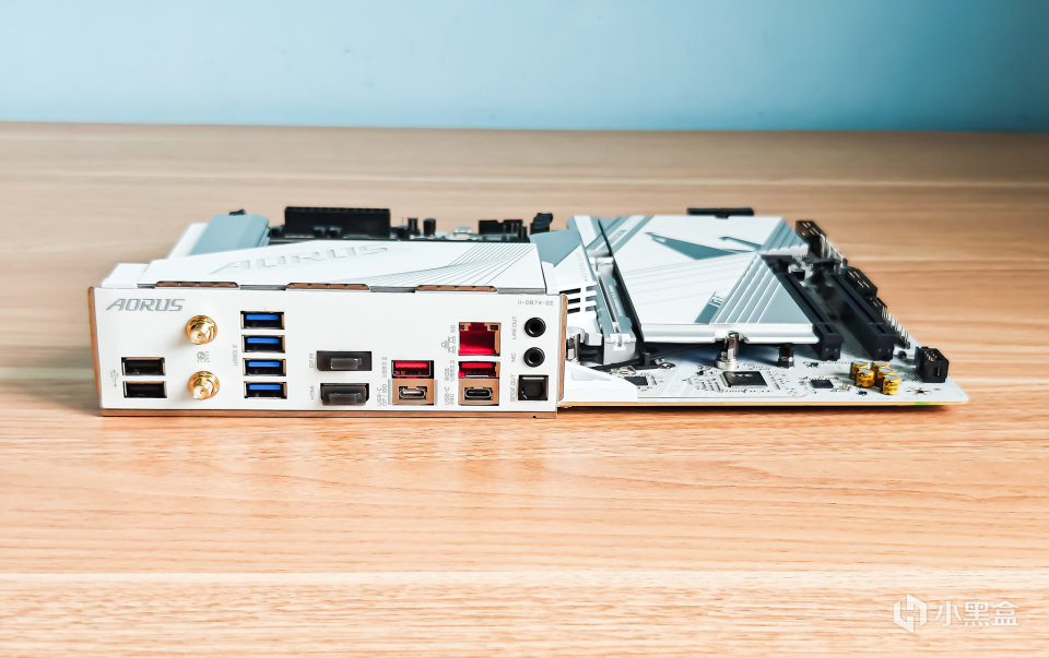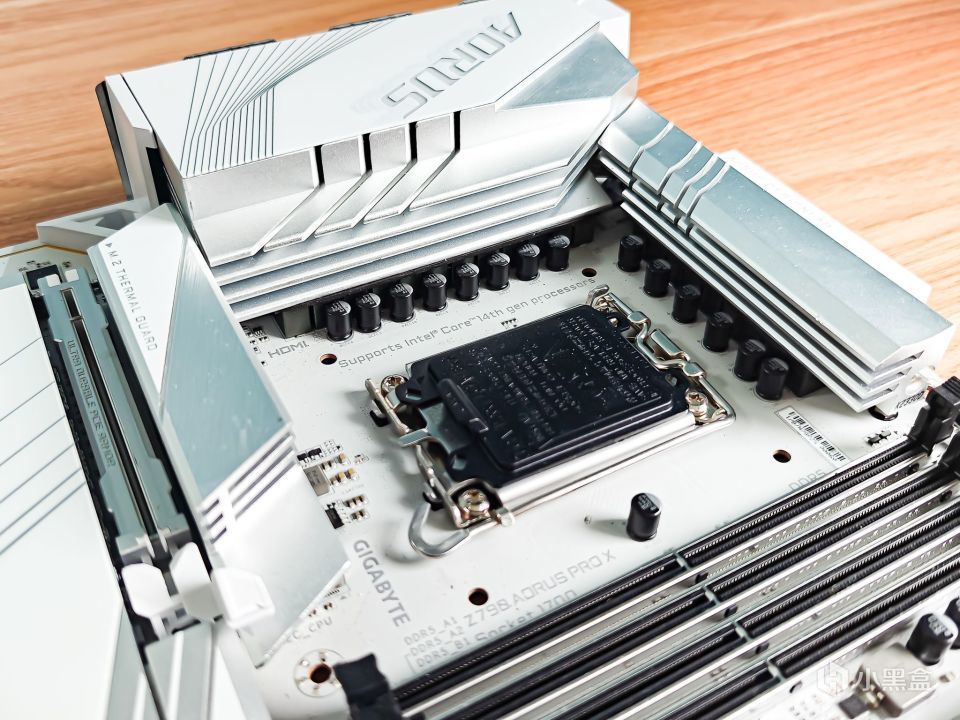 就喜歡這種亮閃閃的感覺,排列整齊的器件,看起來非常舒適。這款技嘉Z790冰雕X主板的供電採用了18+1+2相設計,供電強大,支持頂級CPU少無壓力。CPU主板散熱採用了一體式散熱裝甲,並且有褶皺式設計來增大散熱面積,提升散熱效果。同時,散熱裝甲和VRM之間使用了高品質導熱墊,更有一根8mm的熱管,連接2片散熱片,用來提高散熱效率,保證供電的穩定性。