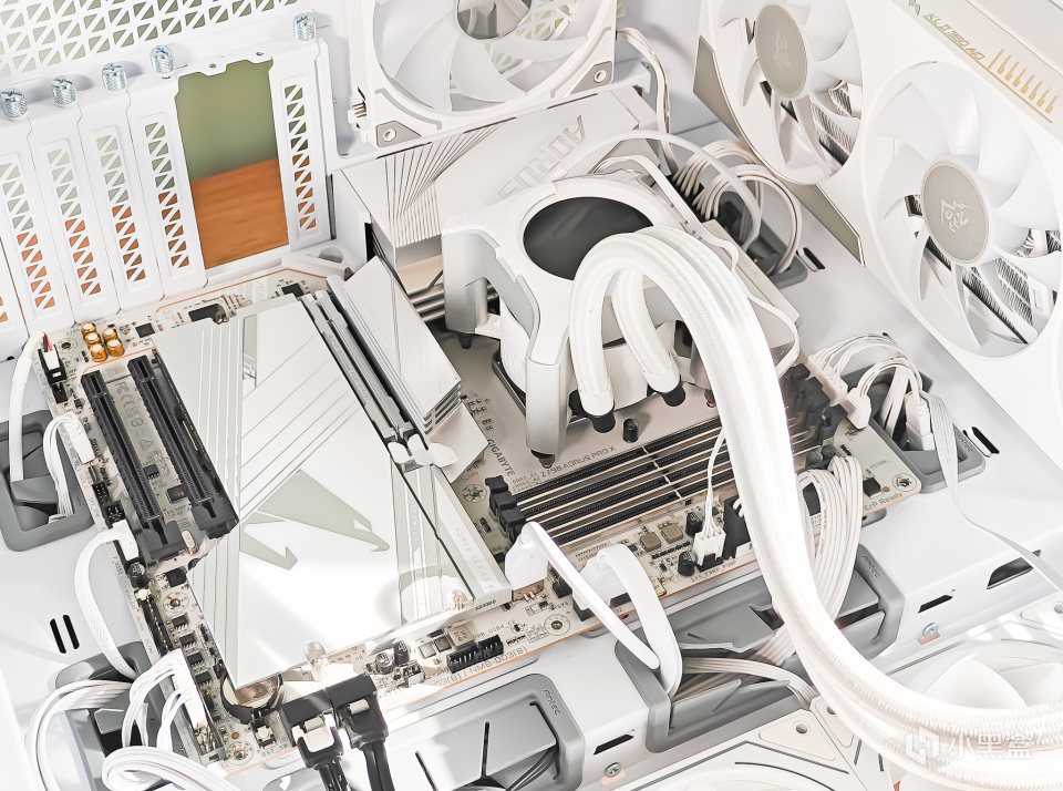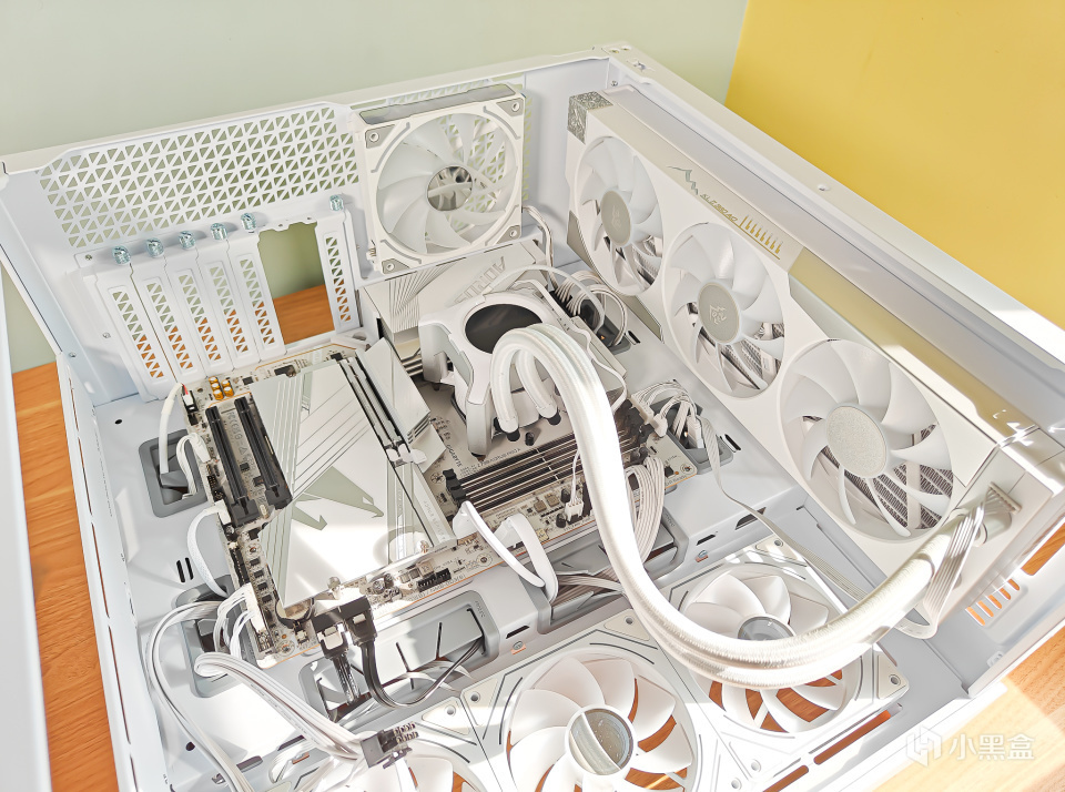 一通操作猛如虎,轉眼裝機九成五。開放式機箱安裝起來的確容易和方便多了,主板、主板、水冷、反向風扇等等都裝好了。水冷是鑫谷的崑崙2代360水冷散熱器,這款散熱器解溫能力高達320W,隱藏式溫控水泵,外形獨特。水泵採用了陶瓷軸承,運行安靜,性能強勁。冷排風扇是三合一預裝,安裝較爲簡單,可以節省安裝風扇的時間。風扇採用FDB白色外觀,同機箱和主板很是搭配。