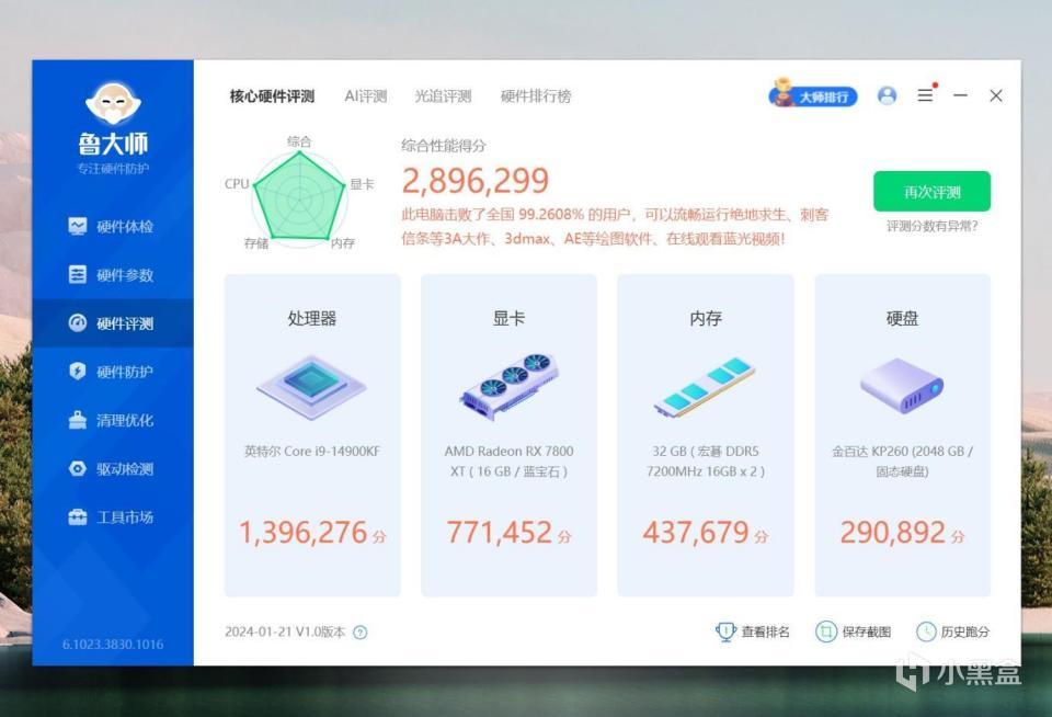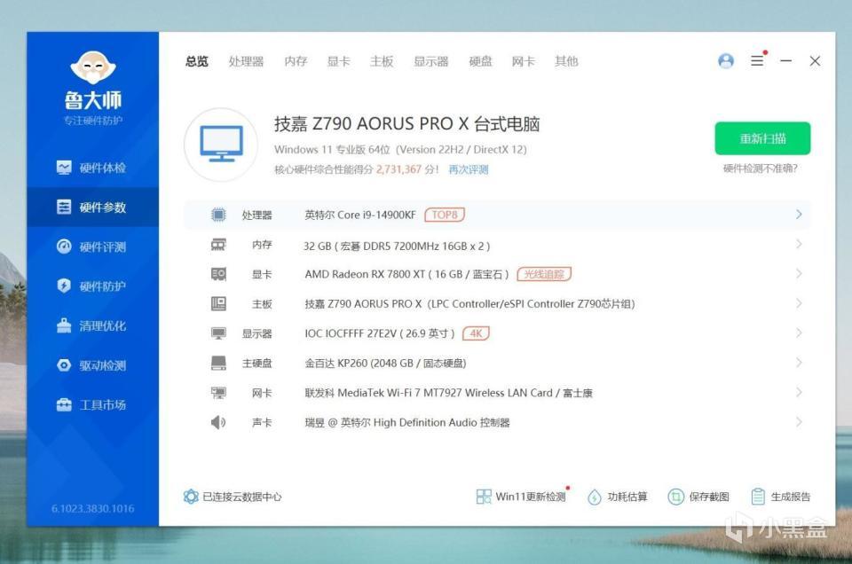 運行魯大師,看看電腦的配置,CPU是i9-14900KF,內存是32GB宏碁 DDR5 7200MHz,顯卡是藍寶石7800XT,主板是技嘉Z790 AORUS PRO X,無線網卡是聯發科的WiFi 7無線網卡。