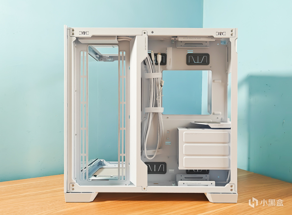 對了,看下機箱的背部,這裏背部設計得當,左側是風扇位置,支持360風扇或者水冷,右側則是有2個3.5硬盤位置和2個2.5硬盤位,同時電源位也在這裏。空間寬敞,佈線容易。