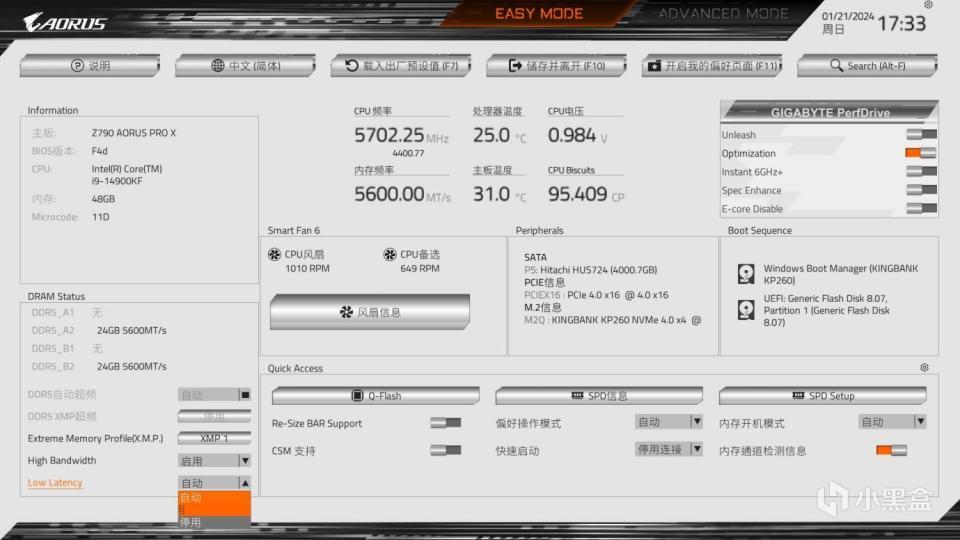接上顯示器線,重新啓動電腦,進入BIOS界面,技嘉的模式有簡易和高級模式,在簡易模式的左下角,就可以啓用內存XMP,和開啓技嘉的黑科技低延遲和高帶寬,從而可以大幅的改稿內存的性能。
