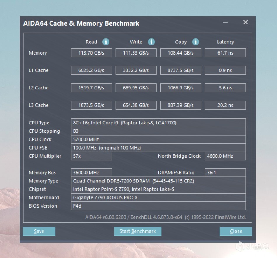 運行AIDA64內存測試,讀取、寫入、複製均超過100GB/s,延遲僅61.7ns。