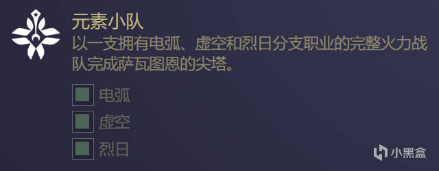 需要在全隊都用電弧/虛空/烈日時通關薩瓦圖恩的尖塔各1次