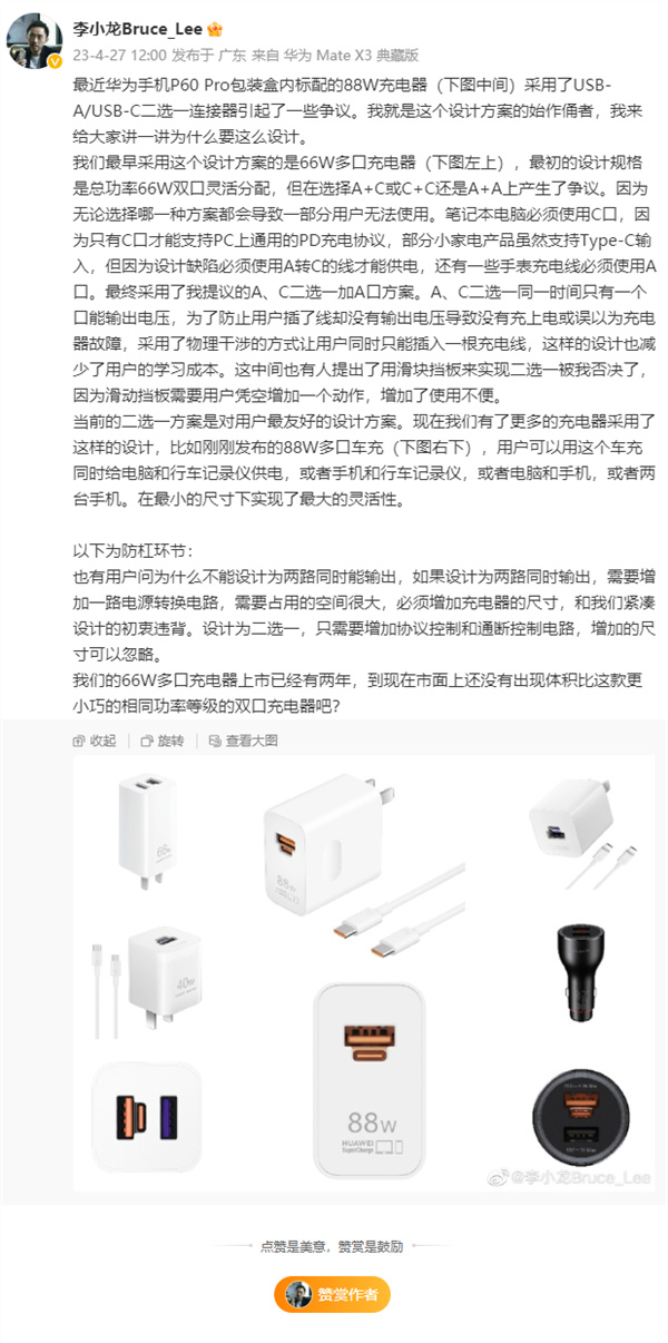 对于“为什么不能设计为两路同时能输出”的问题,李小龙称,这样设计需要增加一路电源转换电路,占用空间很大,必须增加充电器的尺寸。