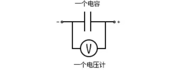 形象点儿来说,实际上的存储单元可以理解为一个电容+一个电压计的组合,就像这样: