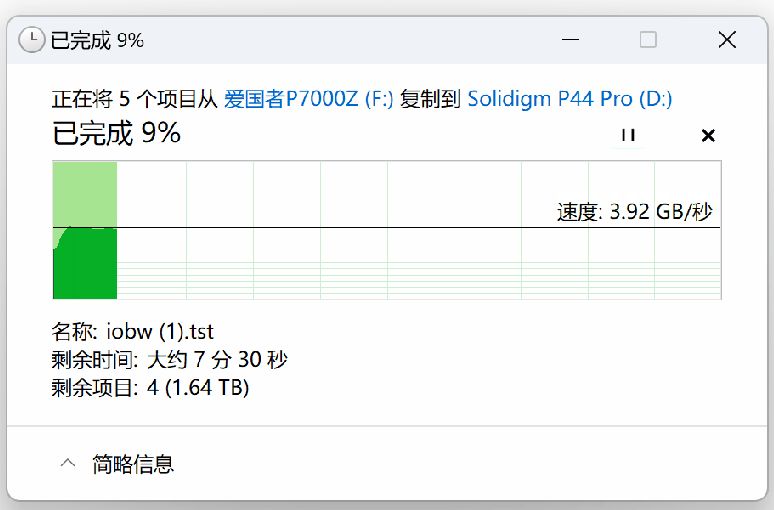 另外在这儿提醒大家一点,同为PCIe4.0满速盘的话,大家就不需要计较最高读取速度到底是7000还是7400MB/s了,实际咱们大多数人用的Windows系统是利用不上极限速度的。Windows的文件资源管理机制做得挺拉胯,使用咱们最常用的复制-粘贴方法,在Win10下向固态硬盘中实际写入大文件,单进程的实际写入速度通常在3GB/s左右;即使升级到Win11,单进程写入速度也无法超过4GB/s。这就是我们大多数普通用户在实际使用过程中能触及到的上限了,其实再快的顺序读写速度我们也用不上。