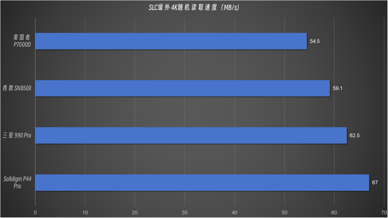 虽然CrystalDiskMark测得的Q1T1 4K随机读取速度是基于SLC Cache模拟缓存内的表现,而我们在日常使用SSD时用到更多的是SLC缓外的4K随机读取速度: