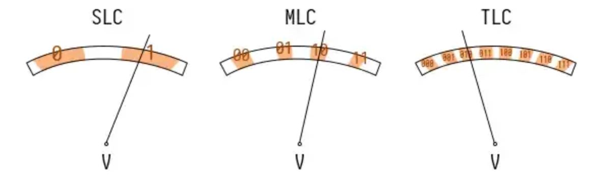 而每个单元存储的数据位数越多,需要的电位精度就越高,充电就更困难,检验失败还需要重新充电,写入就变得很慢;读取时也需要更高的精度,因此也会稍慢。