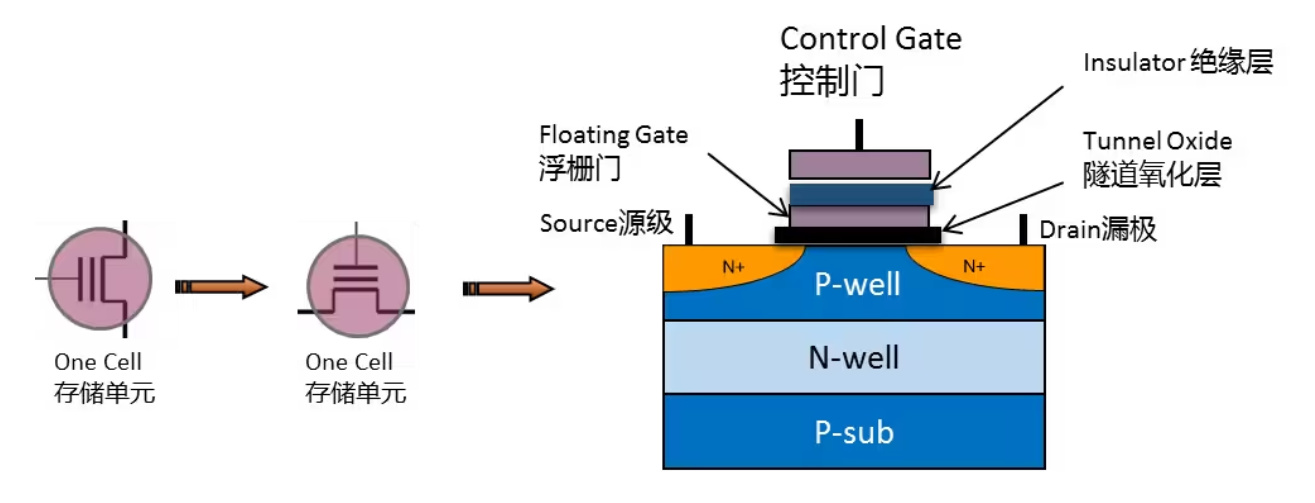 在闪存芯片的每个最小存储单元中,都禁锢着一定数量的电子,可以将其看作一个个微小的电容,或者一个个关着电子的小笼子。