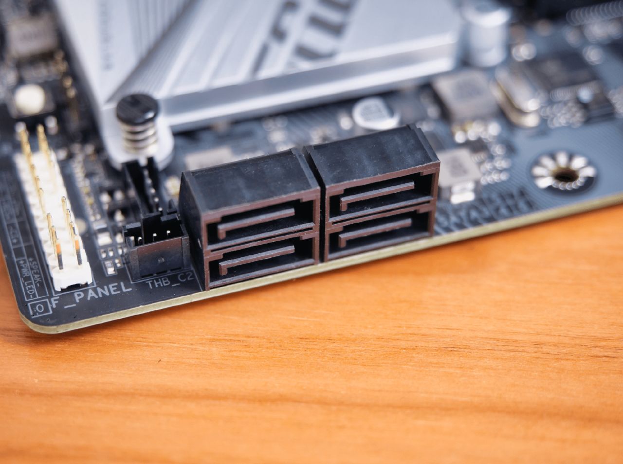 主板上的SATA接口长下图这样,我们只需要使用主板附送的SATA数据线,一头插在主板接口上,然后另一头插在硬盘盘体对应的接口上即可。同时需要注意,2.5寸SATA SSD是要有额外供电的,我们得把电源的SATA供电线也插在盘体接口上才行。