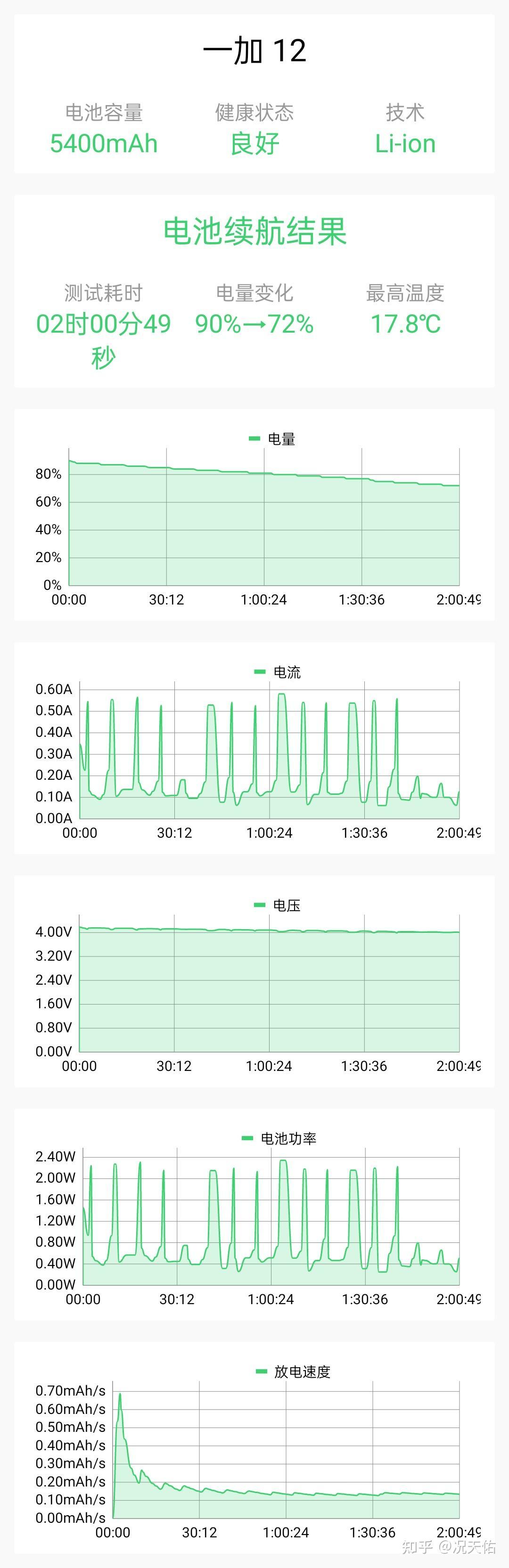 使用电池狗狗对一加12来模拟现实使用场景来进行放电测试,根据电池狗狗提供测试结果,可以一目了然,了解到手机用电的信息,经过耗时2小时49秒后,显示电量从90%降至72%,仅消耗了18%的电量。通过测试可以说明一加12在日常使用中,预计能够持续使用至少10小时。测试时室内温度为12.5℃,而一加12的最高温度仅为17.8℃,有着非常优秀的温度控制能力。