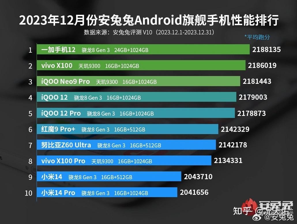 一加12凭借24GB+1TB成功拿下2023年12月份安兔兔安卓手机旗舰性能榜榜首,这主要得益于其出色的硬件配置和性能表现。