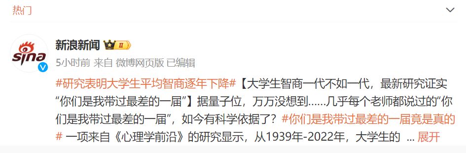 就這個情況,可以有很多種解釋:大學生擴招、人羣集體智商提高、研究對象太少等等。