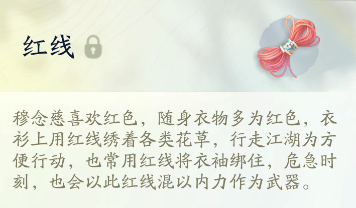 再比如紅線。穆念慈總是一襲紅裝,遊戲也在這裏做出瞭解釋:她喜歡紅色,因而紅線對她來說也是重要物品。紅線在她手上不僅可以在衣服上繡些花草,還能綁住衣袖,緊急時刻甚至可以用於防身。