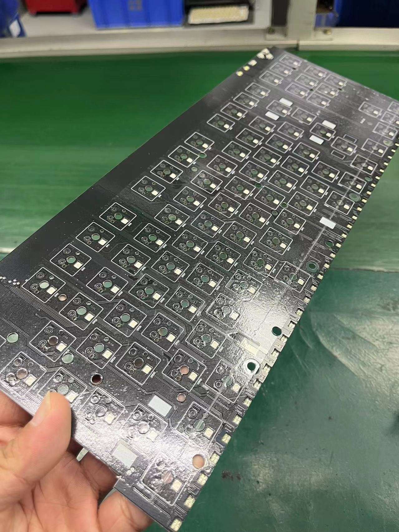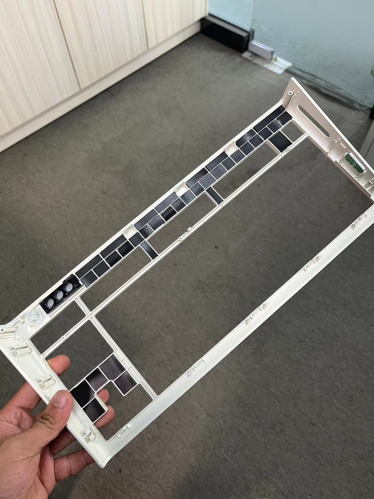 一個是內膽通過很少且小的螺絲固定在底殼,同時用卡口將定位板固定在上蓋,本身的共振並不多,同時在上蓋的縫隙處進行了貼棉,現在鍵盤都只能解決底部的共振,但是卻很難解決上蓋的共振,這樣的方式對模具的要求很高,同時也只能人工完成,與此同時pcb上還有一層也是隻有人工能貼的pu膜,其實就是有些類似保鮮膜。相比pet可以跟好的包裹住軸體中間的腳,因此來讓聲音更集中,