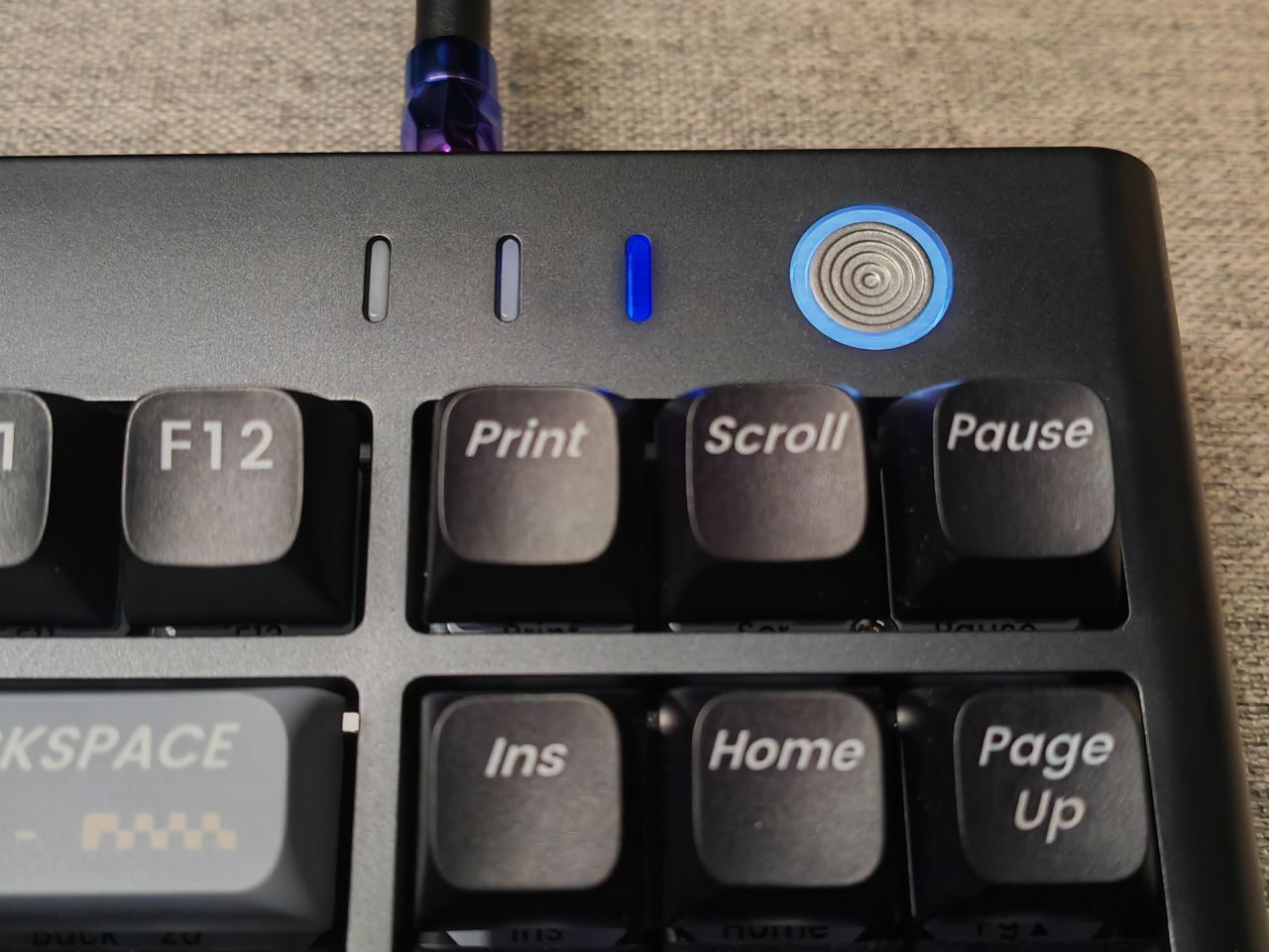 額頭的位置還有一個一鍵鎖屏的宏按鍵這個按鍵位置還是很方便的,以後可以改建的話也會非常強力,指示燈放在了按鍵的旁邊,一個是大小寫,一個是鎖win,還有一個是不同的電量狀態,同時還會顯示有沒有正常連接電腦。在這右邊的話是一個給我感覺像是蘋果手機的側鍵,這個按着可以一鍵鎖屏,以後驅動出來也是可以自定義的,這下可以一鍵啓動原神了。