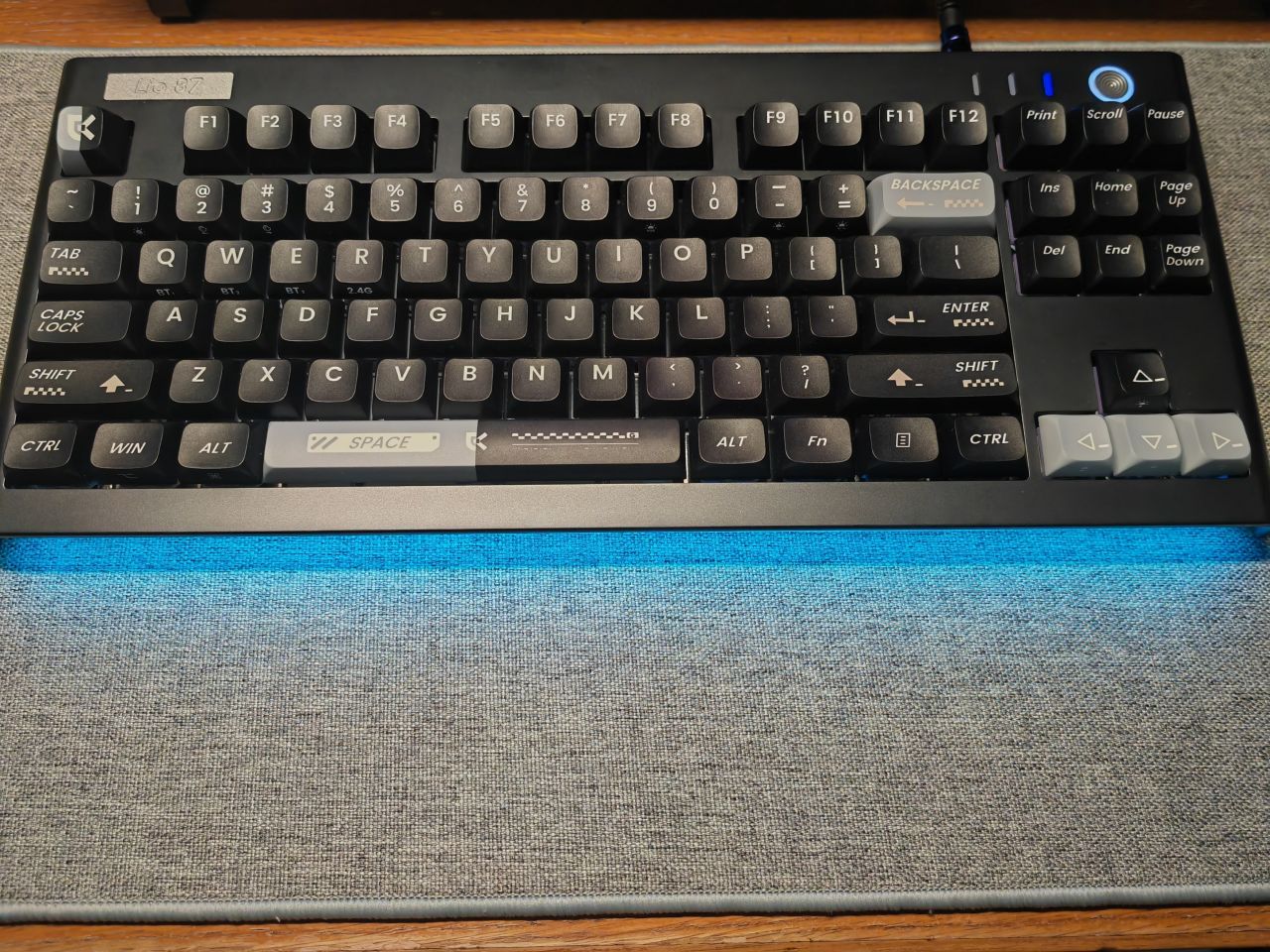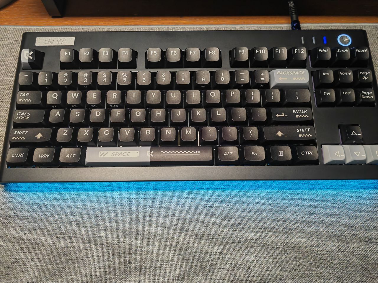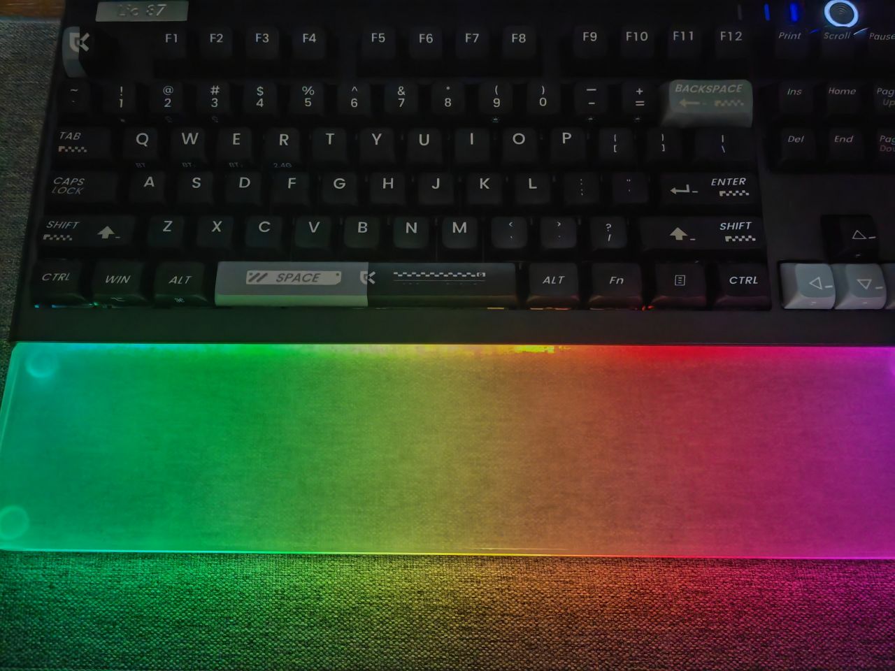 鍵盤上的燈也是很均勻柔和,燈珠質量很好,快門開到240纔會有頻閃,我個人是不喜歡玩燈的,不過初始設置的燈效還是很多的,正面和燈帶的rgb聯動很棒,也可也單獨開關,也可以通過左邊的按鍵單獨開關其中一個燈,我個人是不喜歡玩燈,但是單獨開前側的燈感覺就會很高級,特別是這個藍色的純色,rgb模式用亞克力手託也很有那種玩燈的鍵盤的感覺。