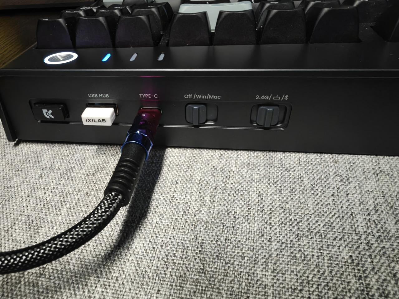 除了這個可以算是鍵盤“外星科技”的設計以外還有很多很方便的設計,一個就是usb的hub,這個hub就能在有線使用的時候把鼠標接收器也插進去省了一個口。鼠標的接收器插在這個位置離鼠標也會更近,信號也會更好。對我來說我會把線插在電腦後面的口,這樣側面原本一用來插鼠標的口就可以用來傳數據之類的會方便很多。不過有個細節沒有考慮到,就是防塵罩沒有開接收器的孔,插上以後防塵罩不能完美蓋住。在hub旁的開關的手感非常的好,開關是突出來的,並且這個行程很大但是同時又不會很緊但也不會推過頭,這個開關應該是我目前用過鍵盤裏最舒服的開關。