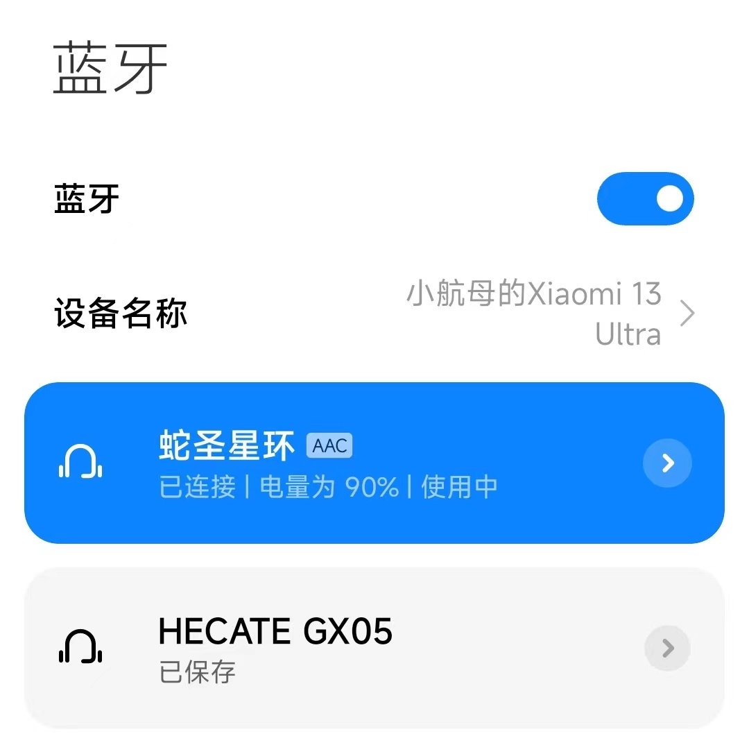 蛇圣星环耳机采用蓝牙5.4连接,连接非常稳定,基本没有断连的情况。手机默认系统能直接显示耳机剩余电量,不需要下载任何APP,这个功能这的很实用。