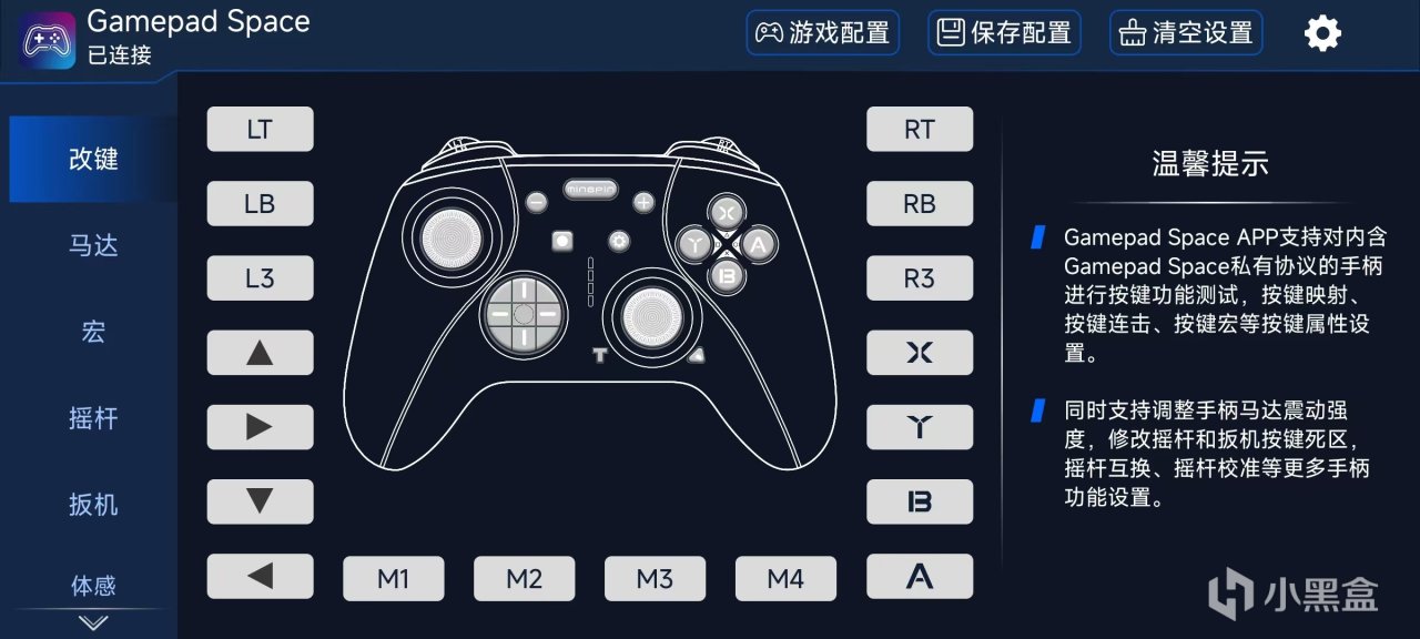 手機下載S830的控制軟件Gamepad Space即可對手柄進行根深一步的自定義設置,在APP中,你可以更改鍵位、調整震感、設置宏、自定義搖桿死區級扳機虛位等,功能非常全面到位。