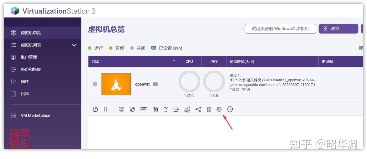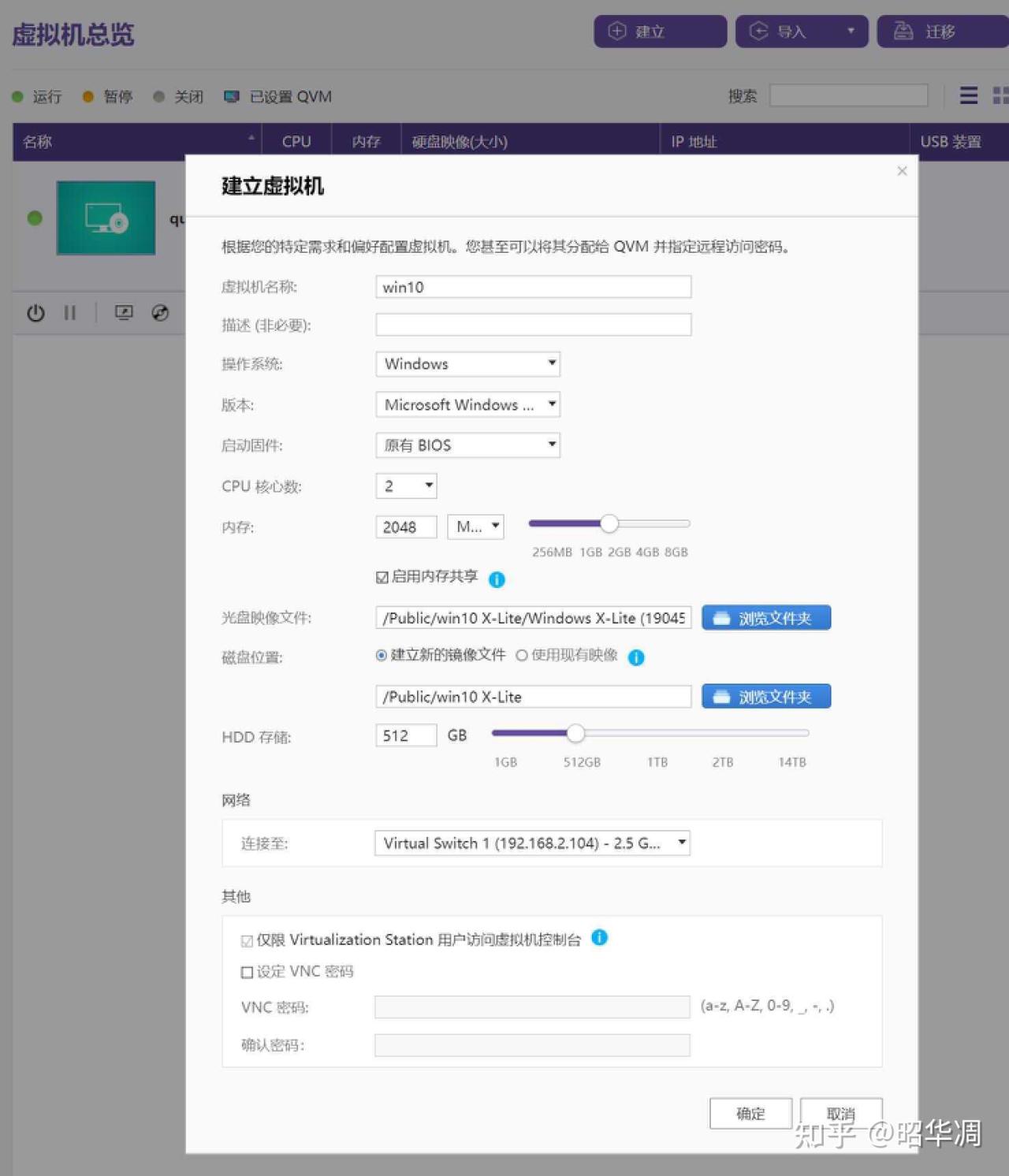 ▼啓動 Virtualization Station,右上角點擊【創建虛擬機】,名稱隨意,然後分別選擇提前下載好的光盤文件,和 win10 的安裝位置,確認即可。