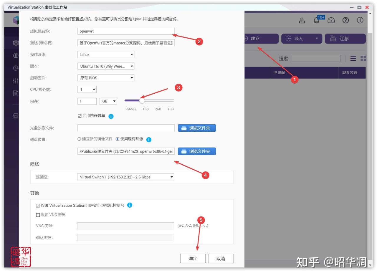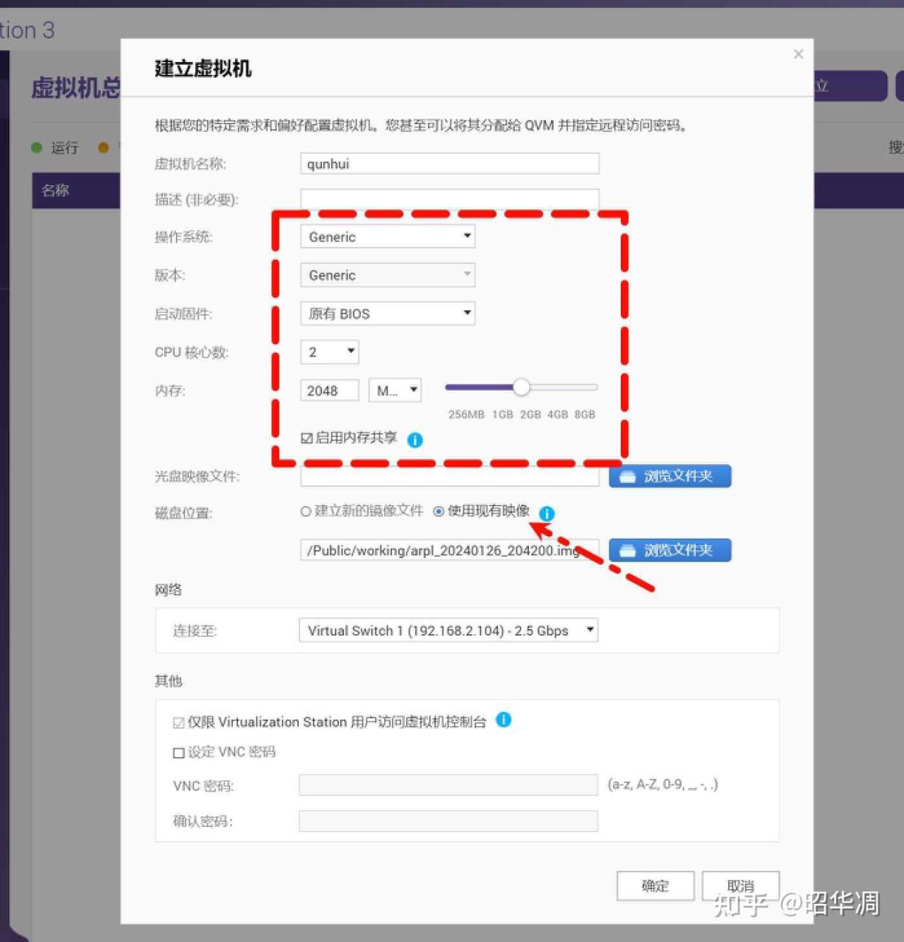 ▼創建虛擬機,名稱隨意,其他參數可以參考下圖,資源我這裏給的 2 核 2G,磁盤位置選擇【使用現有映像】,選擇之前轉換好的的固件,點擊確認。