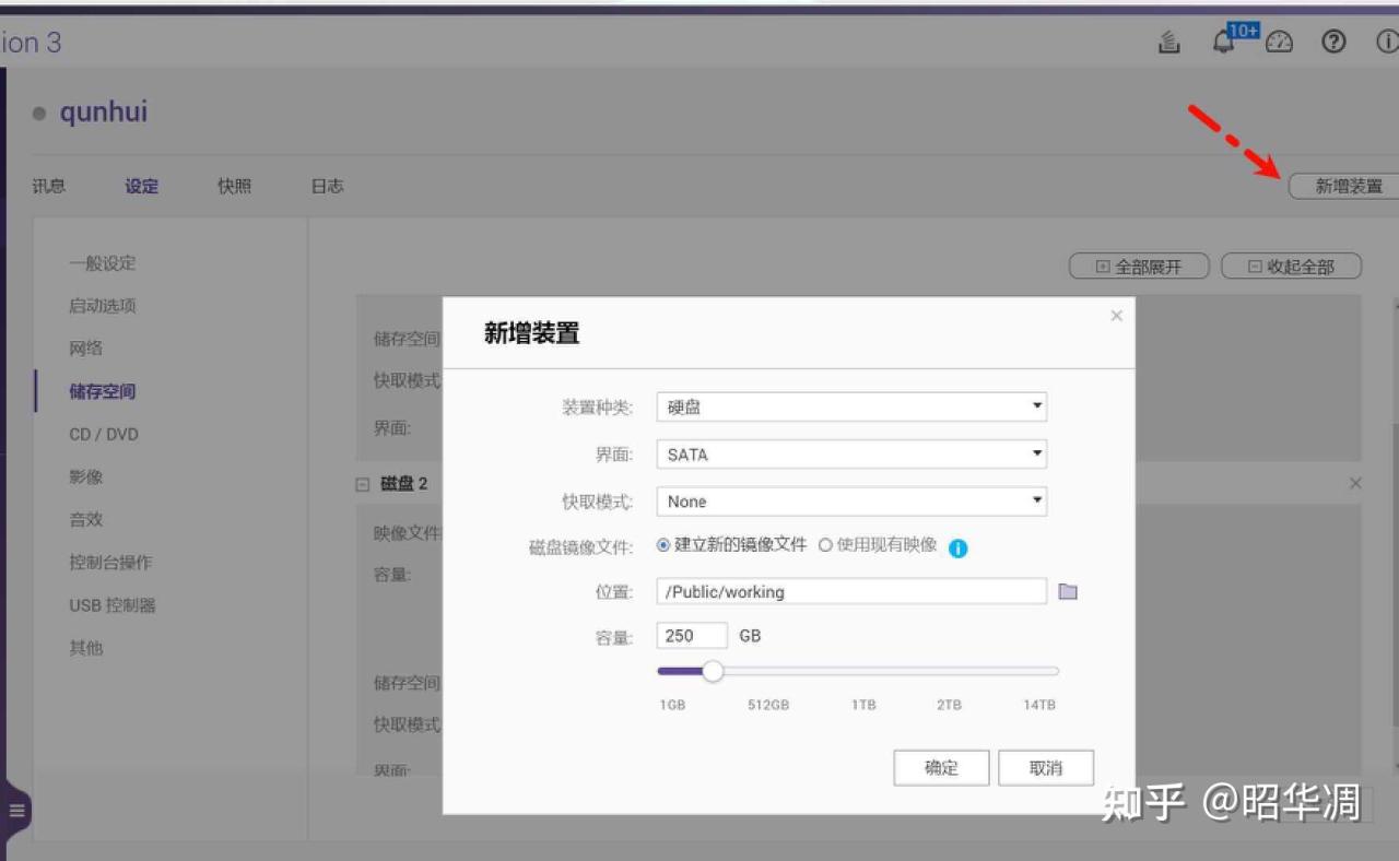 ▼【儲存空間】調整爲 SATA ,右上【新增裝置】,裝置種類【硬盤】。格式【SATA】,容量自定,這纔是羣暉的系統盤,之前創建的是引導盤