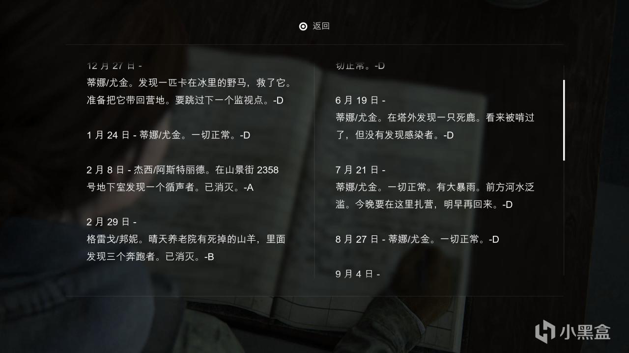 這就是2re給我帶來的感受,不僅如此,2re除了帶來視覺上的盛宴之外,還儘可能地留意到了每一個玩家可能會注意到的細節,並將其一一進行優化,以期給玩家帶來最棒的體驗。當艾莉和蒂娜騎着馬在巡邏的路途上,噠噠的馬蹄聲伴隨着手柄的輕微震動;當角色撞到堆滿積雪的樹時,上面會簌簌落下厚厚的積雪;打開地圖不是瞬間彈出地圖而是緩慢掏出筆記本查看,開槍時的自定義扳機等等,都給我帶來了無與倫比的體驗,就好像我真的來到了那個末世裏一般,就連潛行時都下意識地屏氣以免驚擾到了一牆之隔的循聲者。